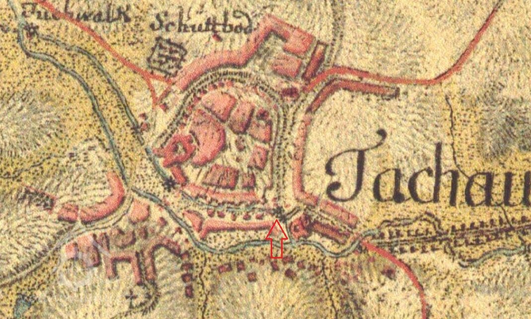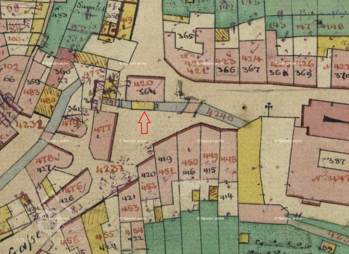 Náhon mlýna protékal městským příkopem, za branou zvanou Dolní nebo také Špitálská zmizel v podzemním kanálu, byl tvořen odtokovým kanálem od výše položeného Městského mlýna čp. 129.